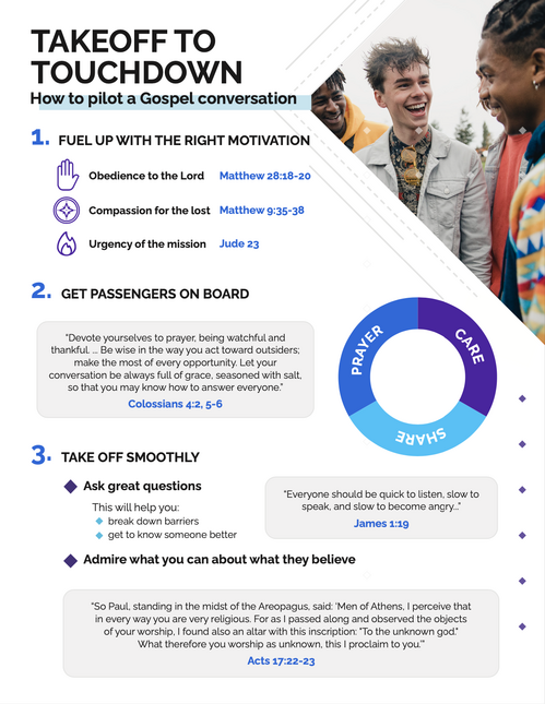 Before you take off, you must be fueled with the right motivation otherwise a conversation with someone will go nowhere or not even make it to the final destination. The Bible talks about the correct motivation for sharing the gospel is obedience to God, compassion for the lost, and urgency for the gospel to reach more people.