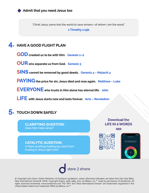 Use the acrostic at point #4 to clearly communicate the gospel. This is not a script for you to read directly off of but rather a tool for you to remember. This acrostic goes through the entire Bible starting in Genesis and ending in Revelation. Memorizing this acrostic will ensure that you don't forget any part of the gospel while in converstion. You can stick close to these notes or go more in depth! This is here to help you have a clear gospel conversation.